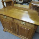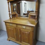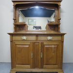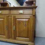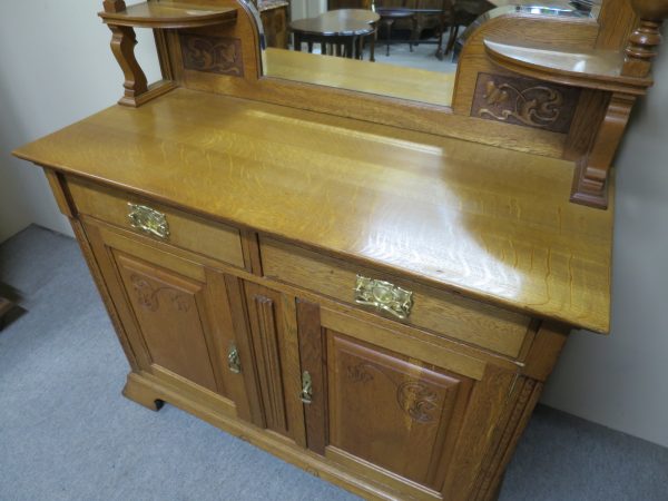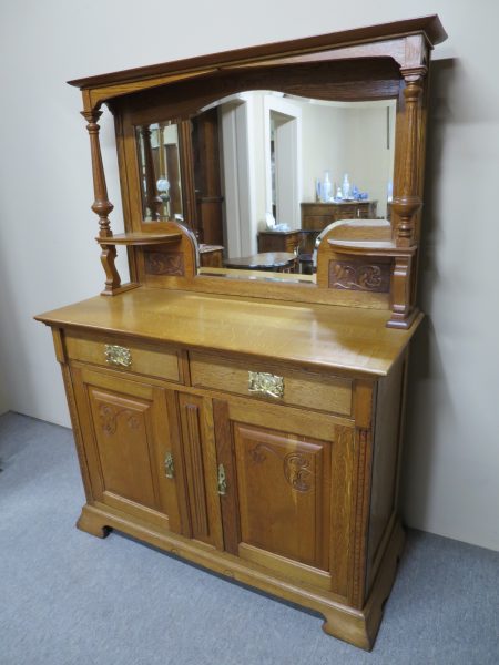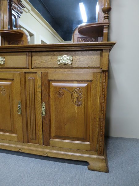 English Art Nouveau 2-door sideboard in golden oak, retaining the original shaped and bevelled mirror. In detailed condition. Circa 1910.