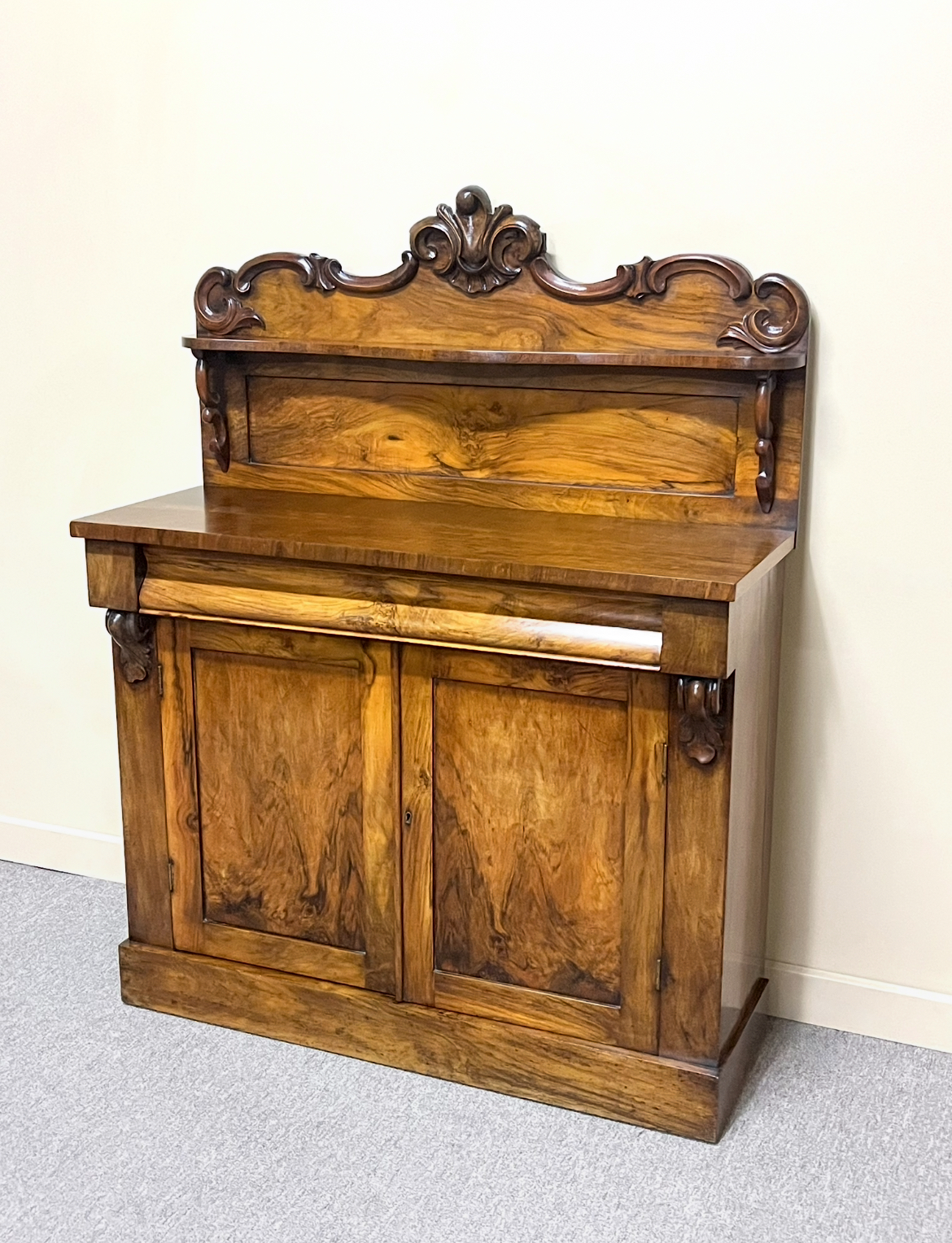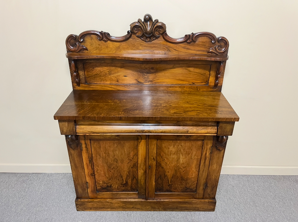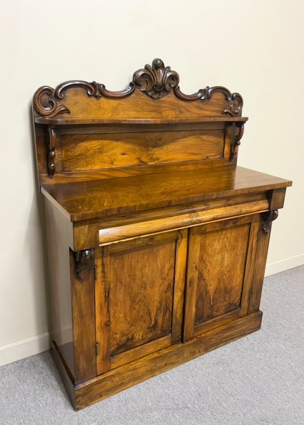 A good quality 19th century Victorian period figured walnut chiffonier with beautiful figuring throughout and lovely ogee shaped drawer front. The shaped back features a small display shelf and carved scrollwork. England, circa 1870. In wonderful detailed condition.