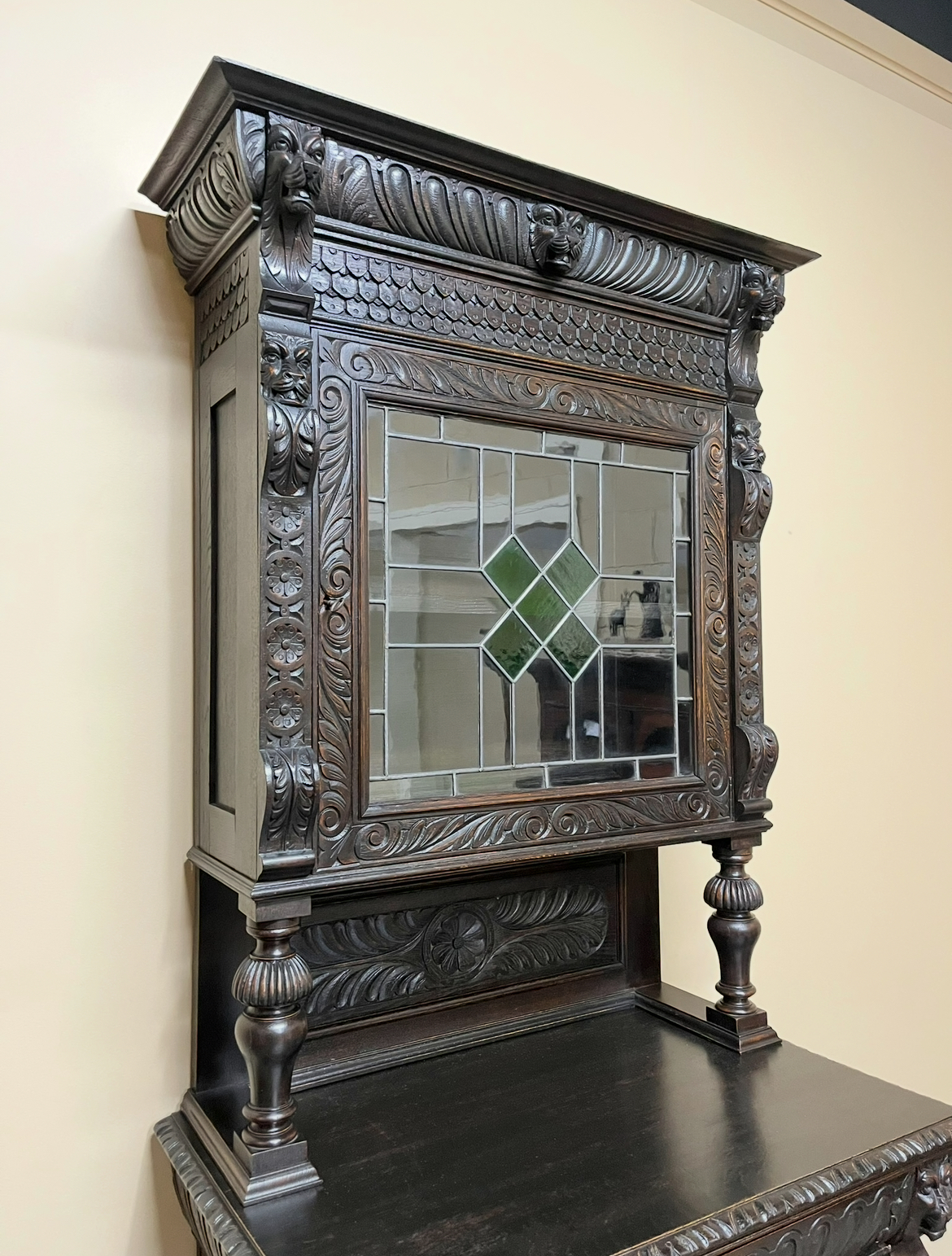 19th century English oak cabinet in the Renaissance Revival style featuring extensive carved detail and leadlight glazing. It has a maker’s plaque inscribed with the name ‘J. Hunter & Co. Manchester’. Circa 1880.