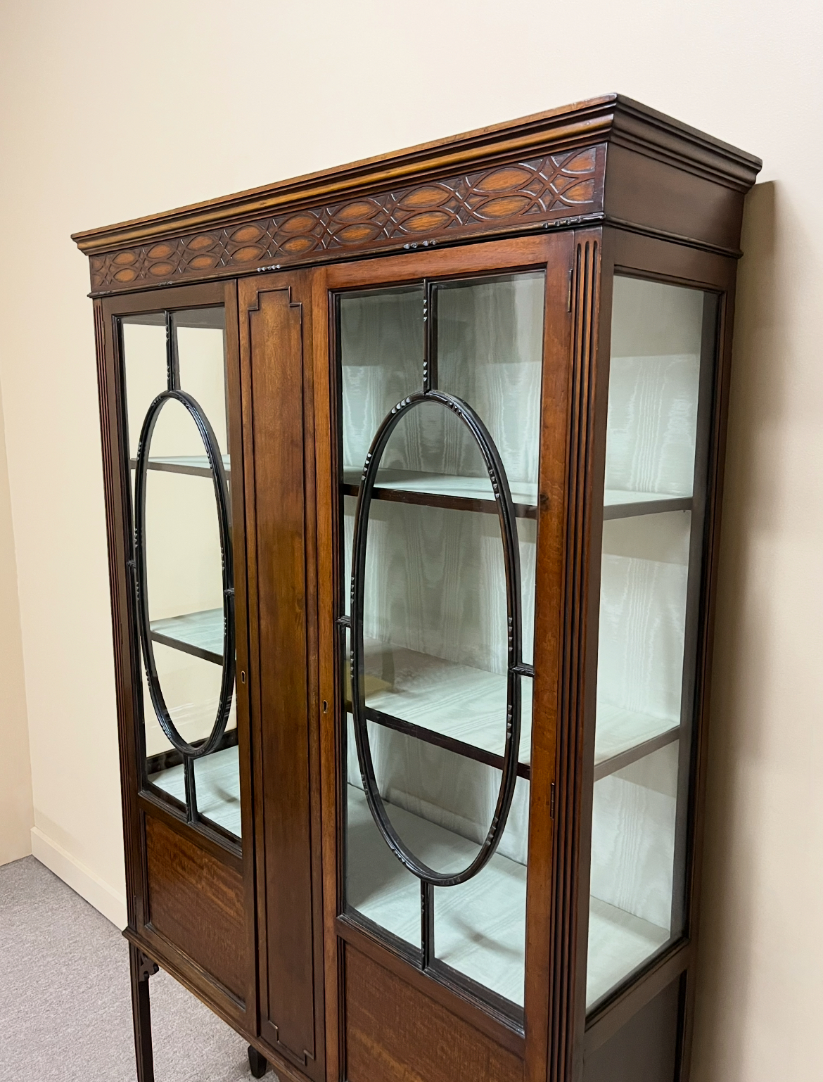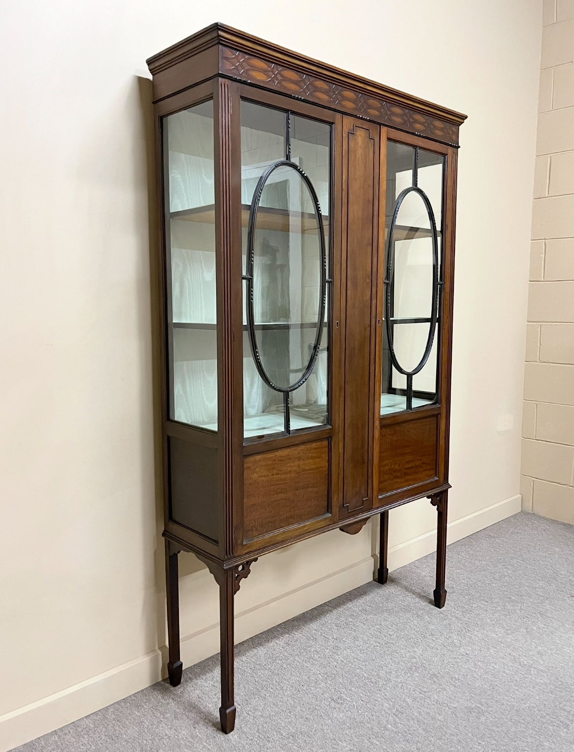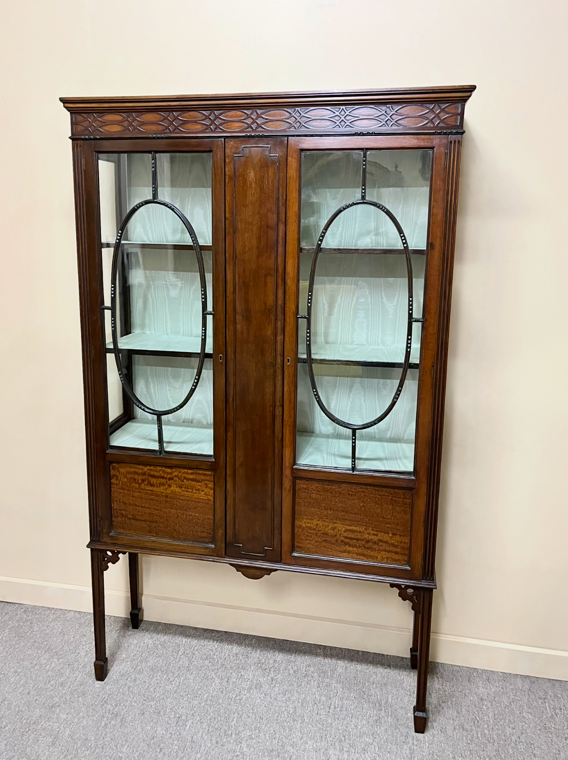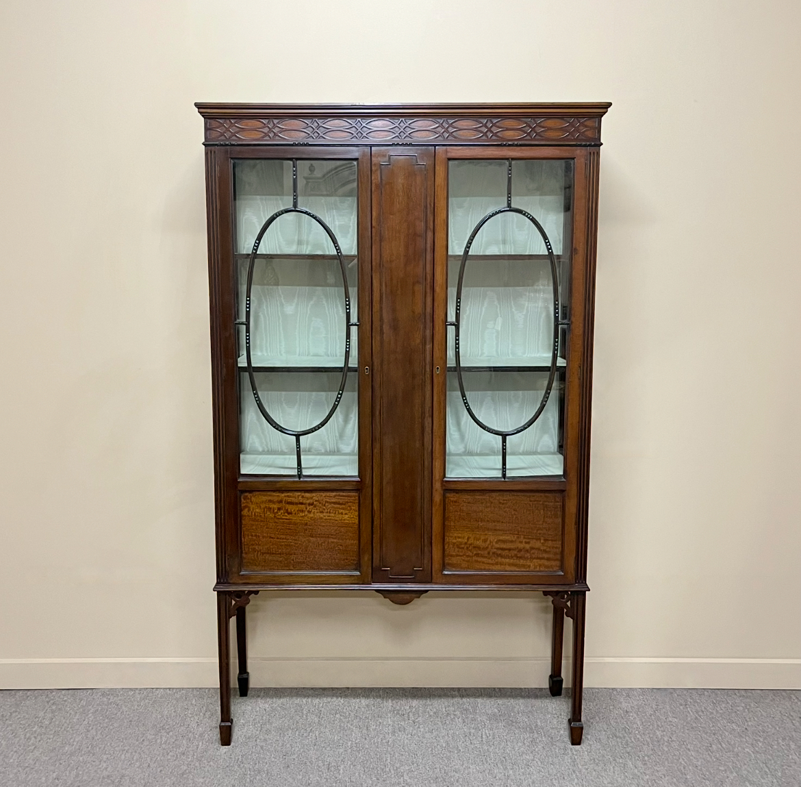 English mahogany display cabinet in the Georgian Revival style. Behind the pair of glazed doors, you’ll find three levels of display, perfect for showcasing your treasured collectables. Discreetly concealed beneath the display area is additional storage to keep your space tidy. The cabinet is supported by elegant square legs and is presented in detailed condition. Circa 1900.