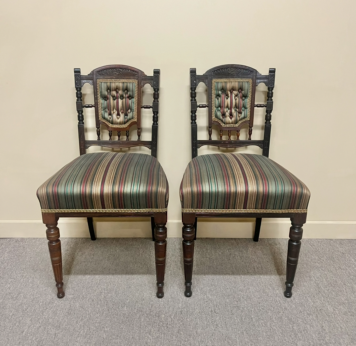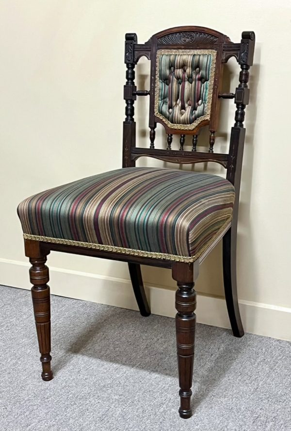 19th century English Aesthetic Movement accent chair in rosewood with finely turned legs and decorated with intricately carved detail. In very good, structurally sound condition. Two chairs are available and price is per chair.