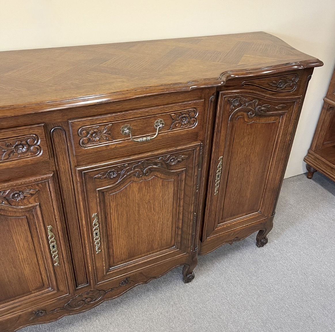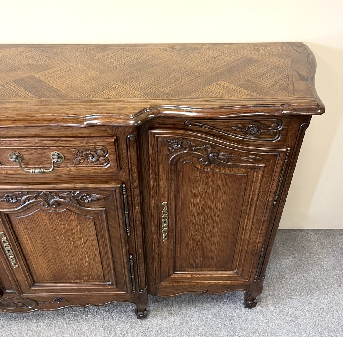 A beautiful French breakfront buffet in oak featuring a parquetry top, curved sides, two drawers and four carved and panelled doors, raised on cabriole legs. In wonderful restored condition. France, c.1940.