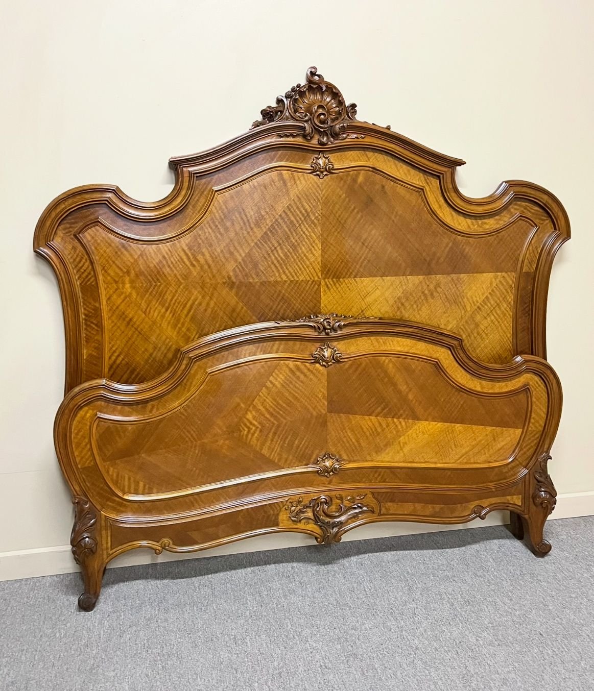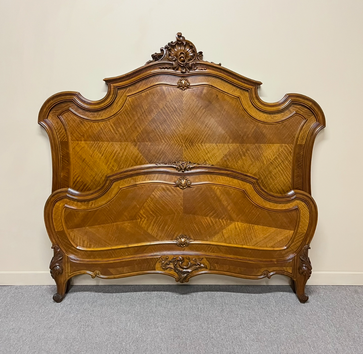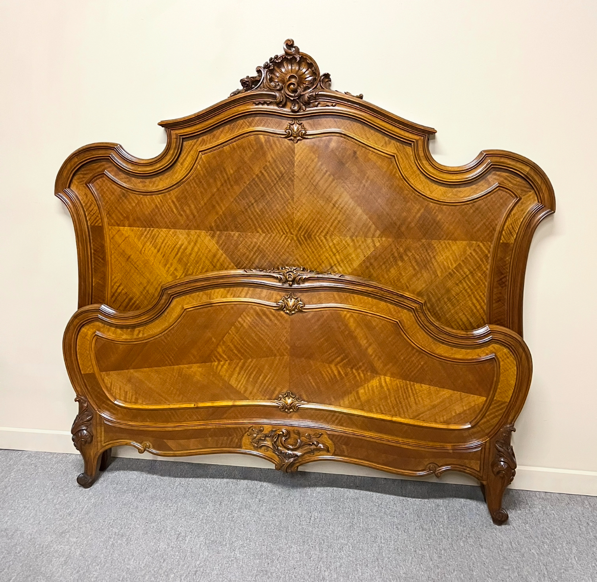 A good quality antique French Louis XV style double bed in fiddleback walnut, beautifully shaped and proportioned with lovely carved detail. In wonderful restored condition with original matching timber side rails and custom slats. France, c.1900. Width of the bed measures 149cm at the base and 165cm at the widest point.
