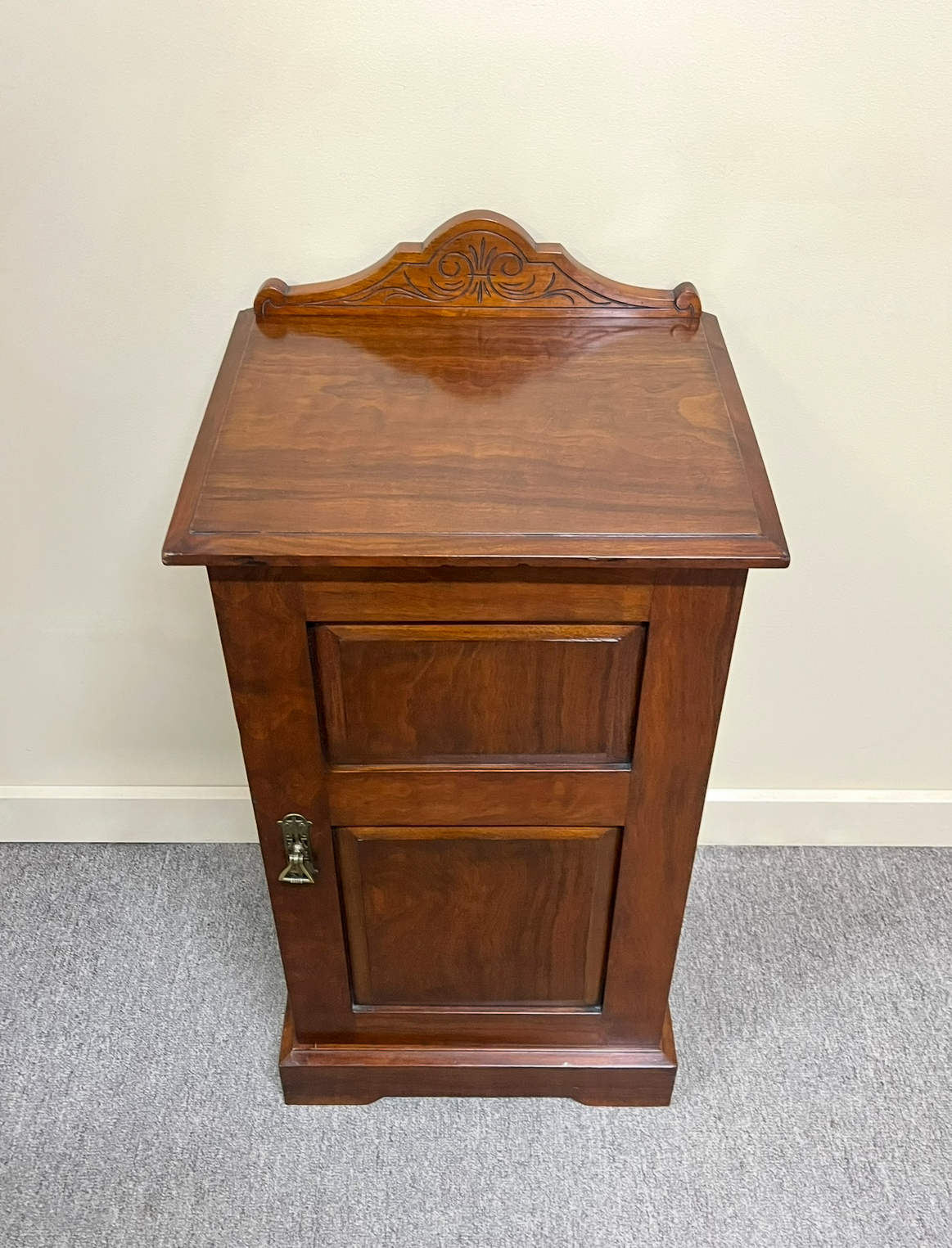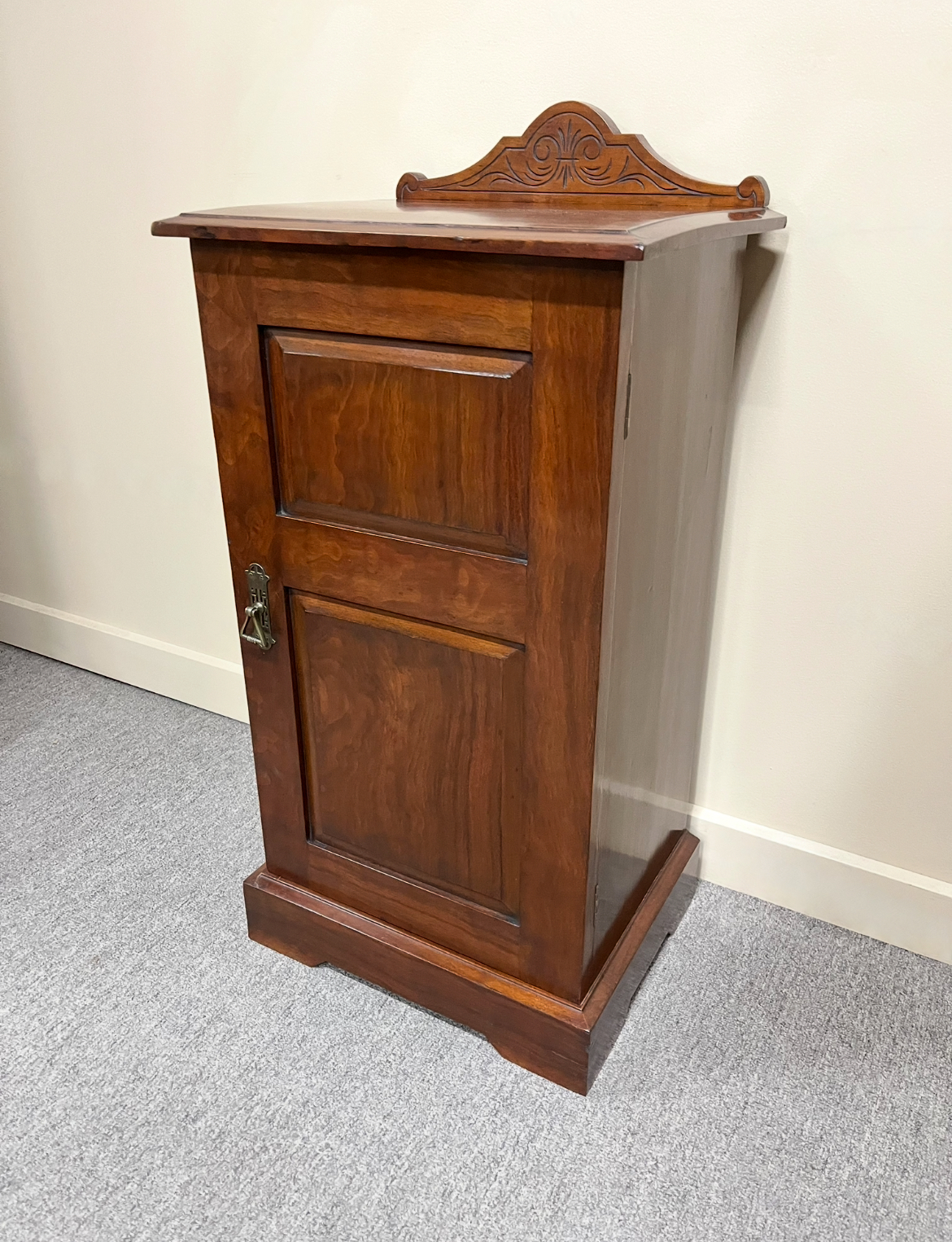 Late Victorian walnut bedside cabinet with a low shaped back and a panelled door, featuring an elegant pierced drop handle. England, circa 1890. In detailed condition.