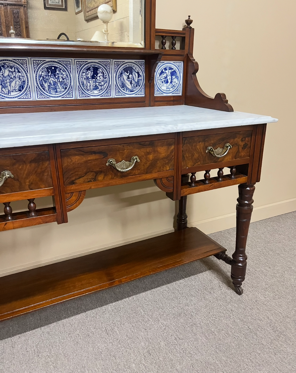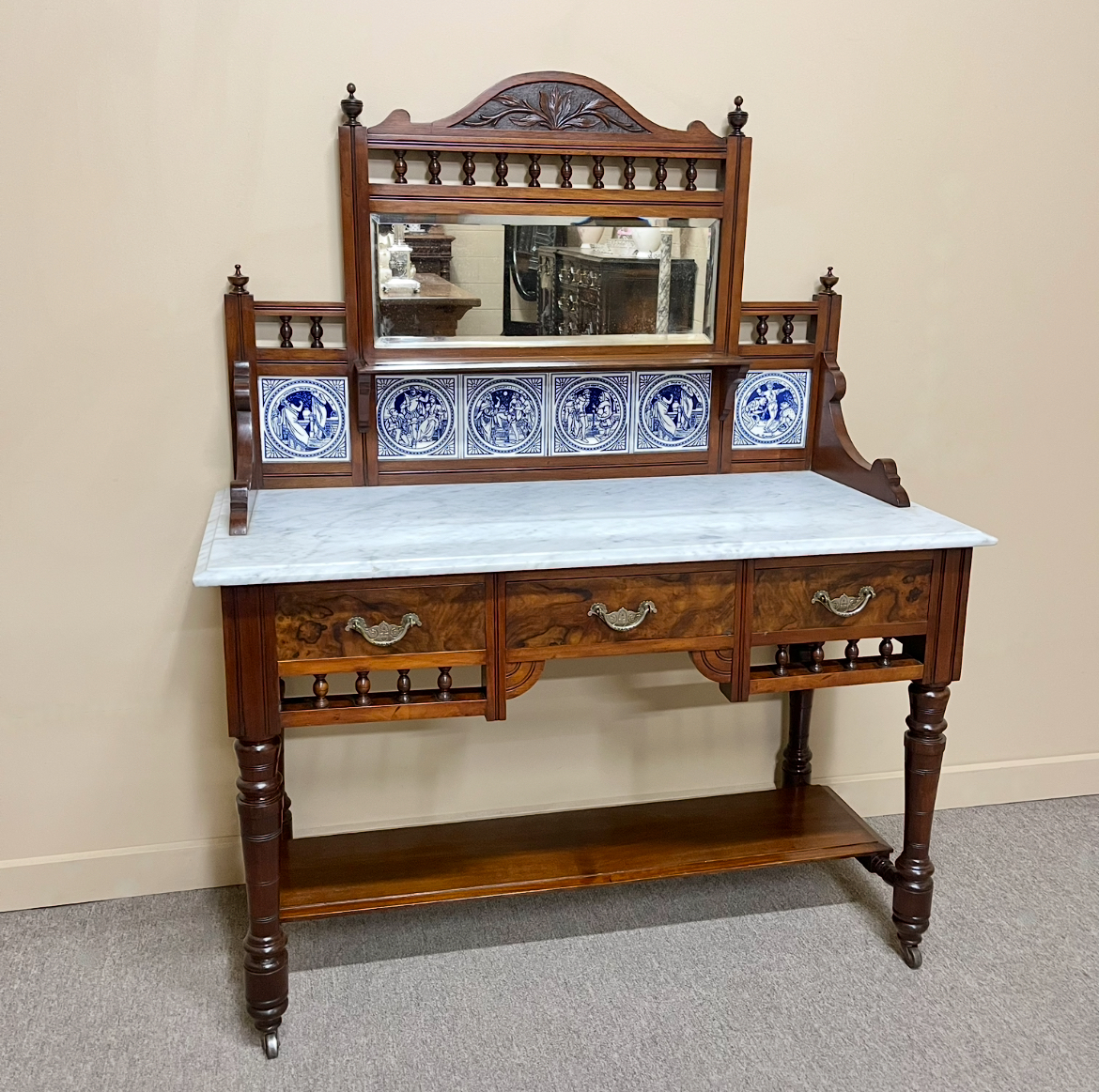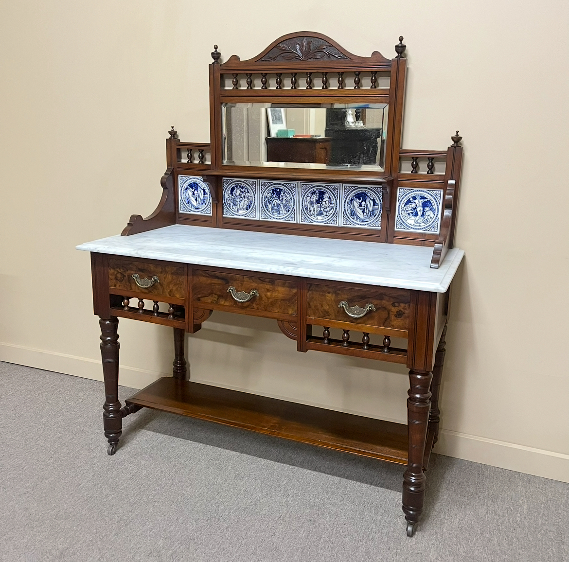 Late 19th century Victorian walnut and figured walnut washstand with a white marble top. The tiled backsplash features blue and white Minton tiles depicting scenes from Shakespeare plays. Circa 1890.