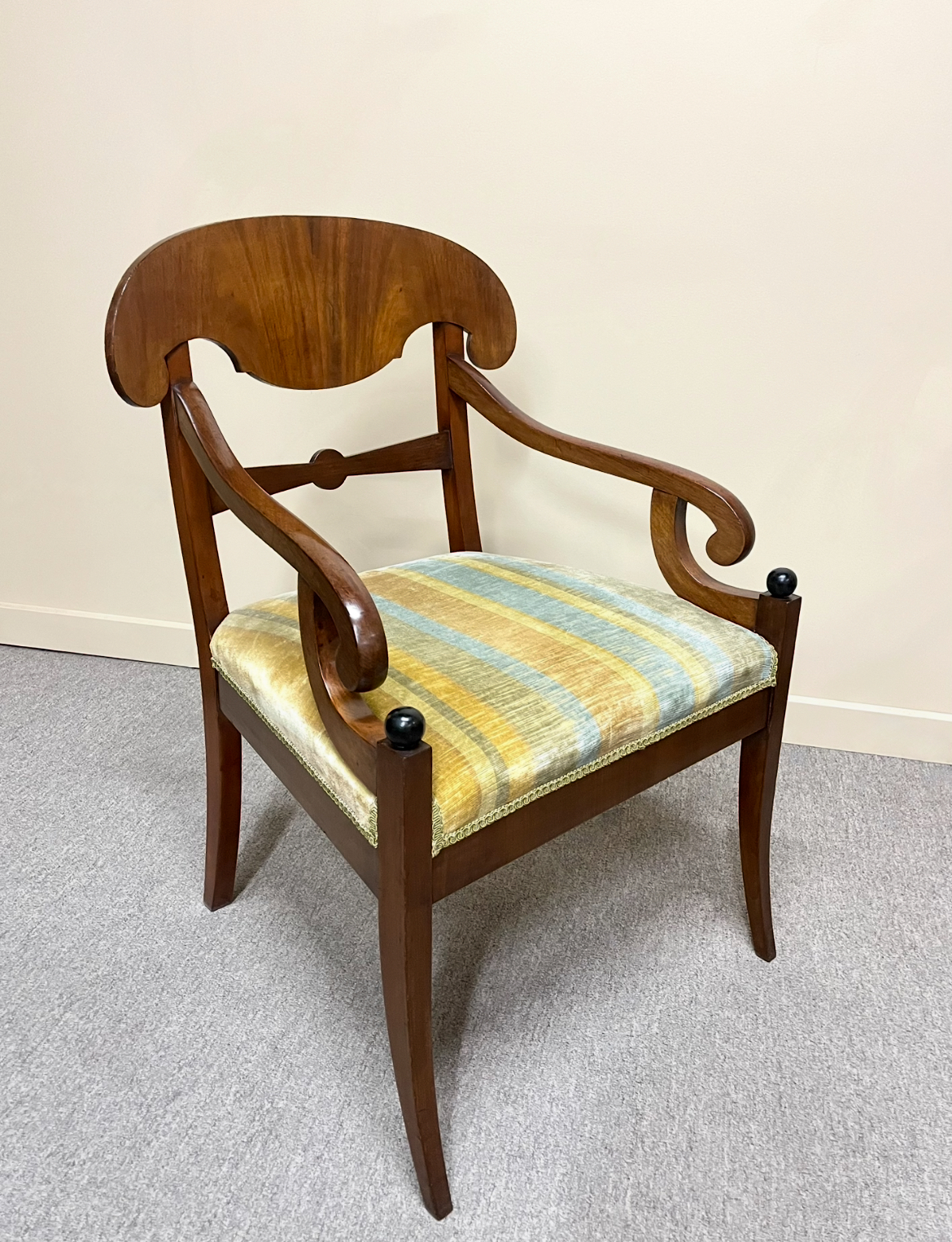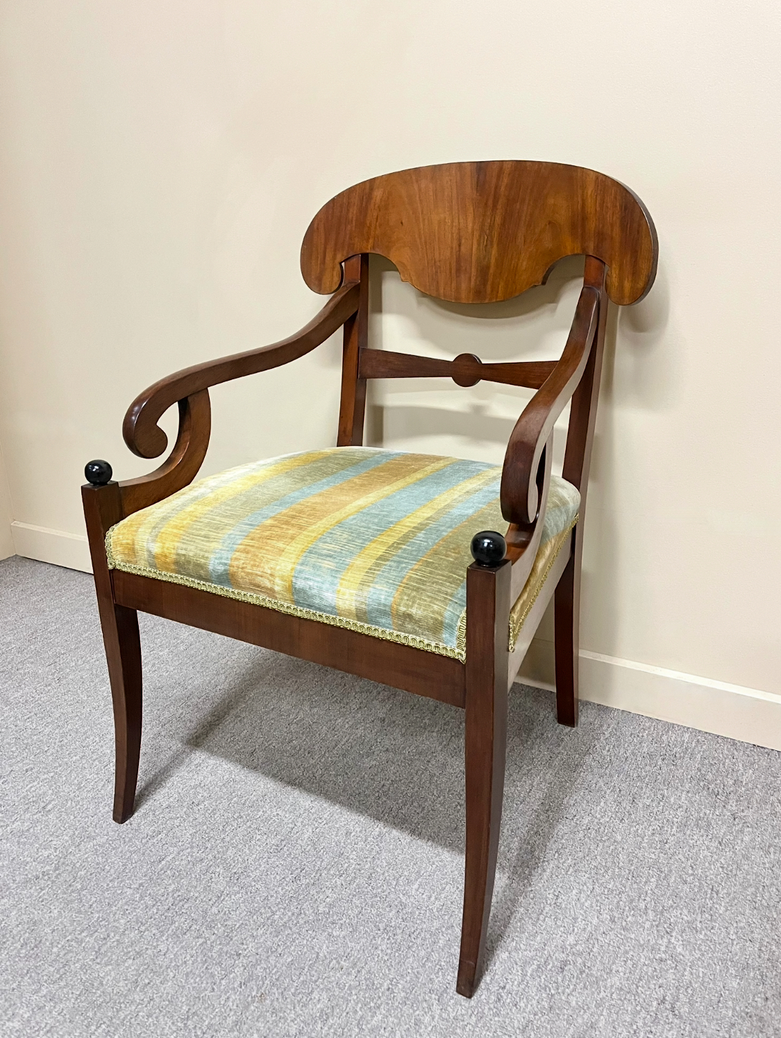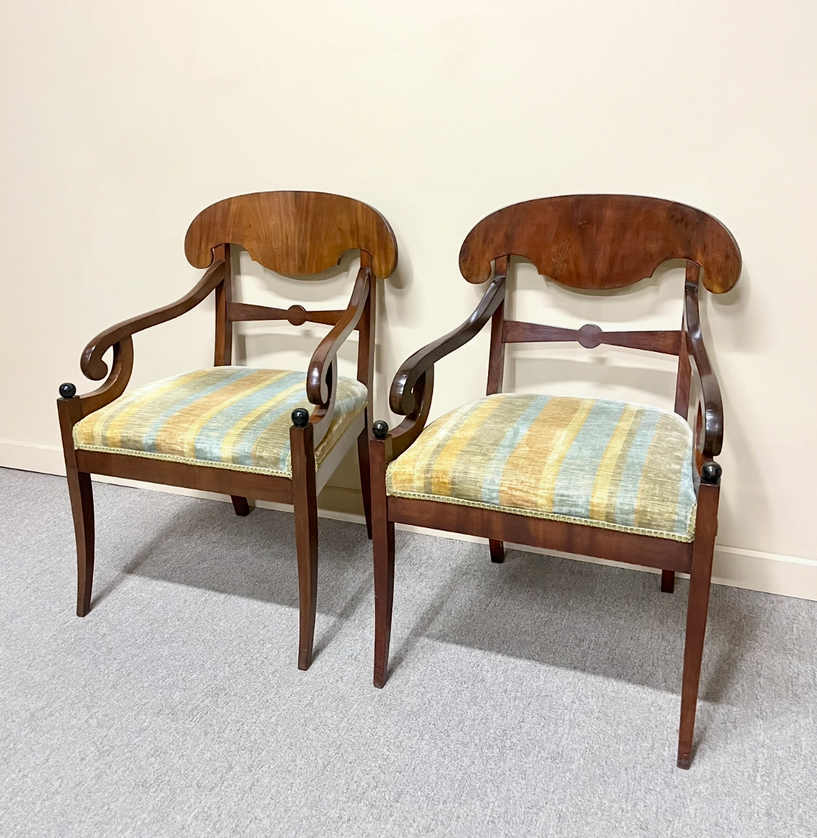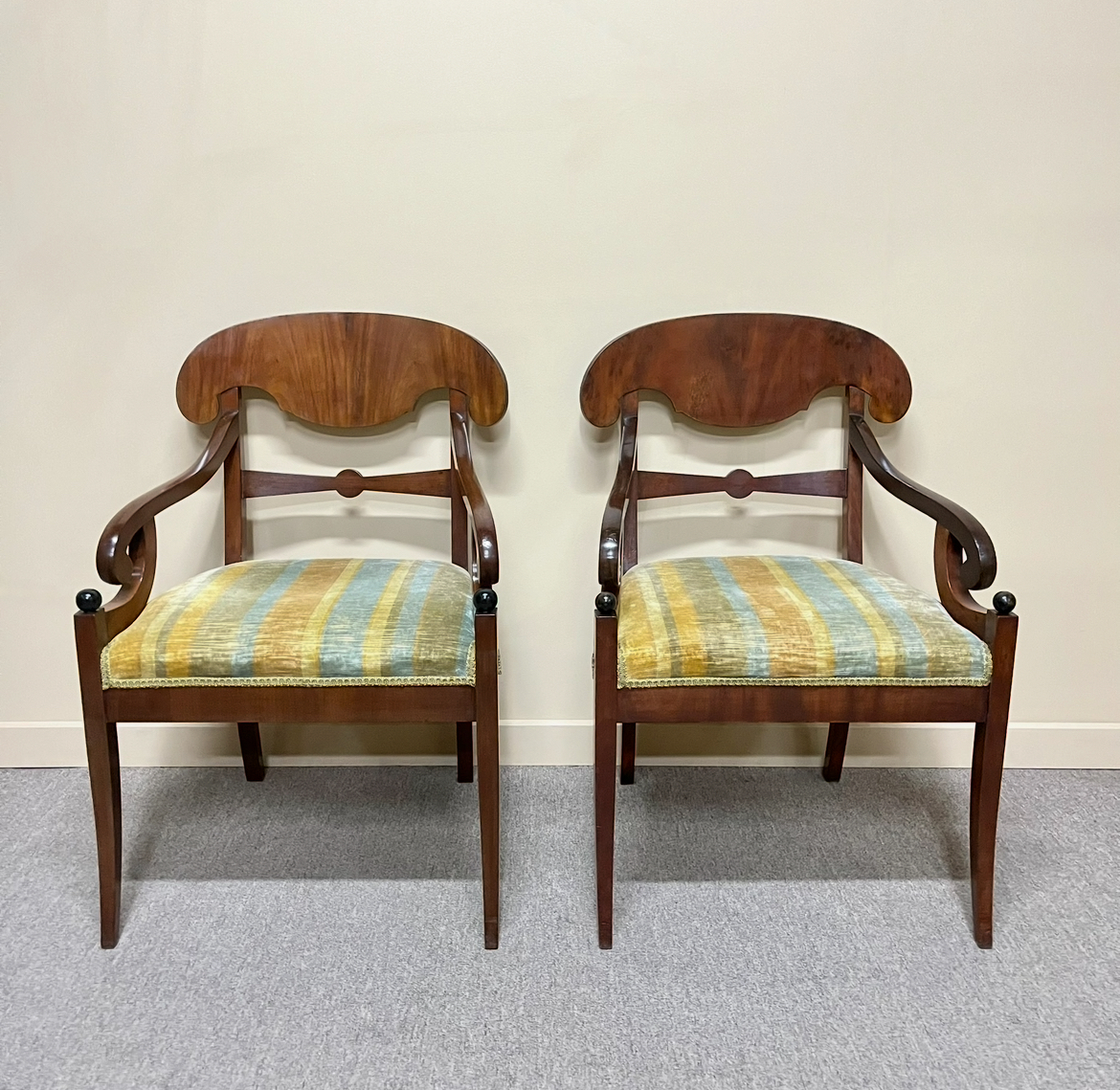 Pair of Swedish flame mahogany armchairs in the Biedermeier style with a curved, Pelta-form top rail, gracefully scrolled arms and sabre legs which taper downwards and curve slightly backward at the rear. Retain vintage striped velvet upholstery. In wonderful detailed condition. Sweden, first half of the 20th century.